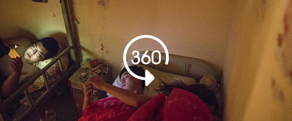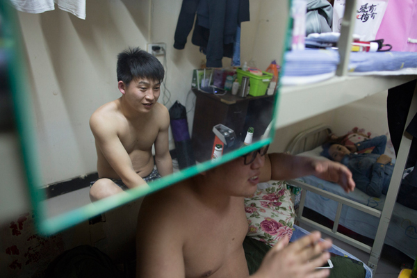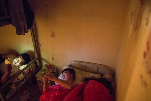 2016年4月10日,北京,因為當天宵夜太晚,周文才與老婆擠在宿舍單人床上對付一夜。 彭湃消息記者 徐曉林 圖