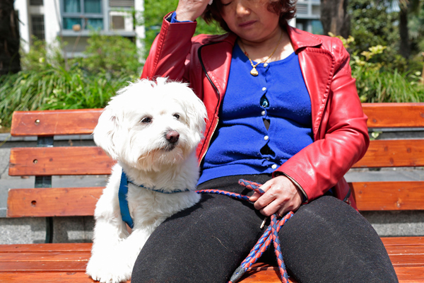 2016年4月8日,上海,鐘點工趙春琴在一戶人傢做鐘點工,任務之一是幫著遛狗。彭湃消息記者 許海峰 練習生 海陽 圖