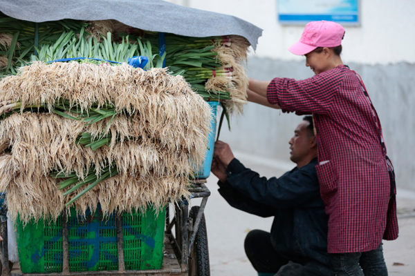 2016年4月9日,曹安公路邊上的江橋星火村。一對棲身於此的外來打功夫婦預備將年夜蔥發賣到市場。 彭湃消息記者 許海峰 練習生 海陽 圖