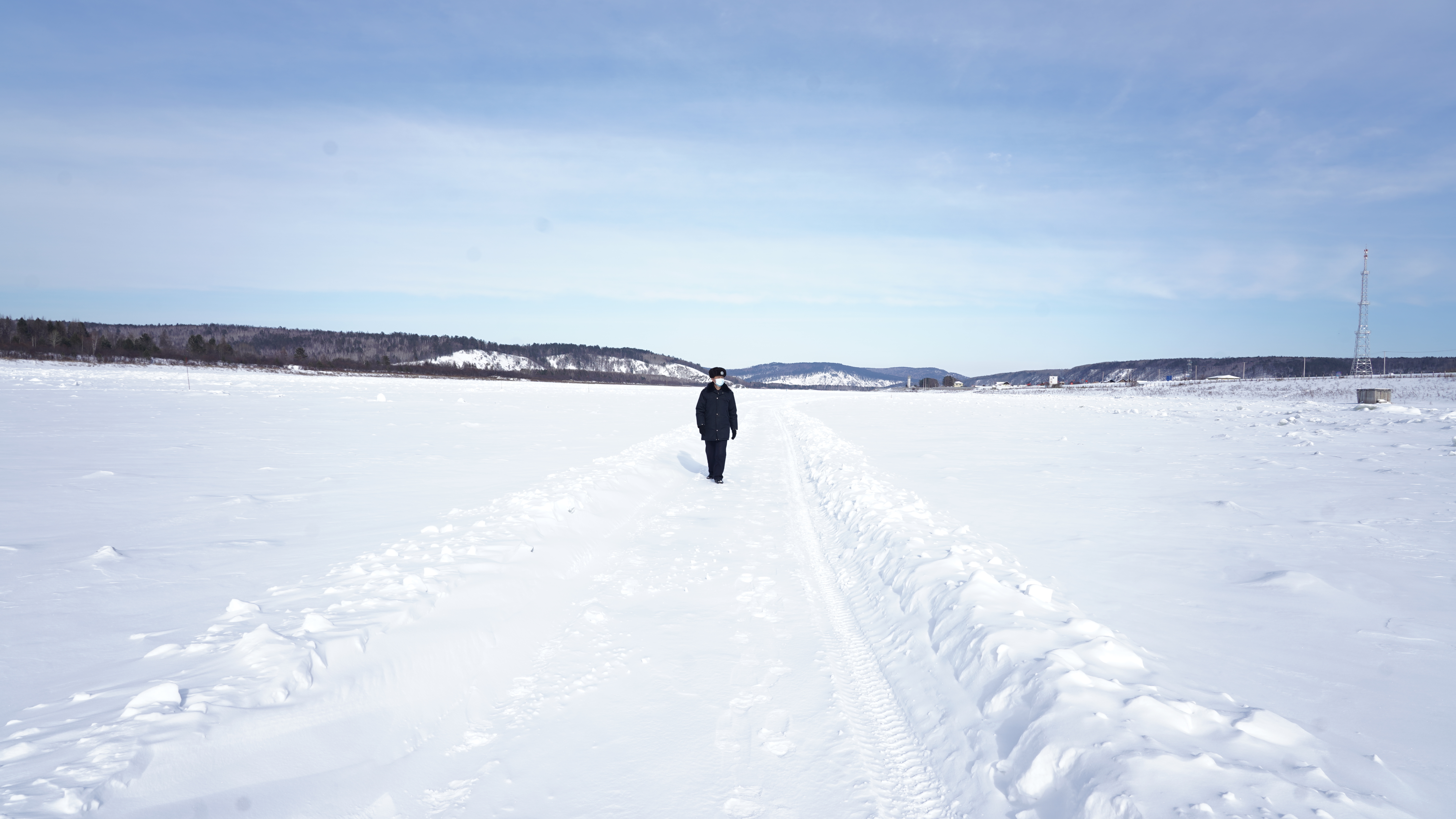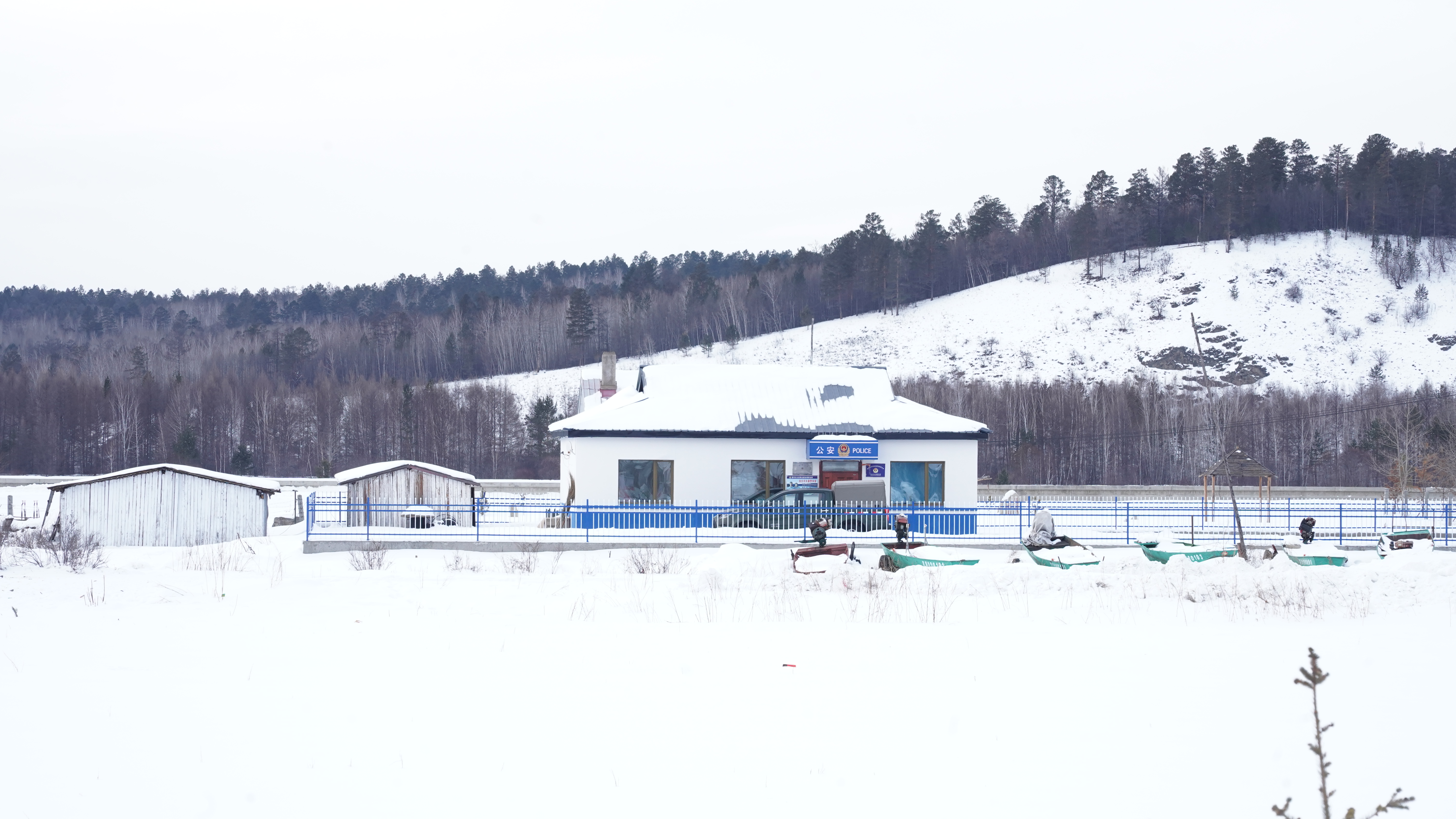 警務室外,氣溫零下二十攝氏度,洛古河村路面上的積雪沒過瞭膝蓋。幾百米外的黑龍江凍成寬廣的江道,下面展著一米多厚的雪。